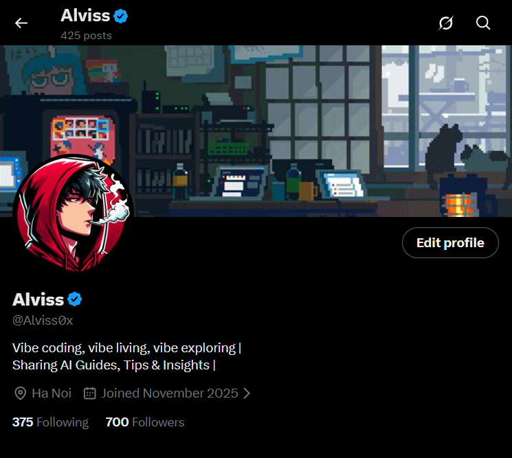 Archetype analysis The Connector Alviss vibes coding, living, and exploring while sharing no-nonsense AI guides, tips, and insights. He shows up every day, builds in public, and turns simple posts into lively conversations. His feed is a friendly hangout for builders who love AI and code.