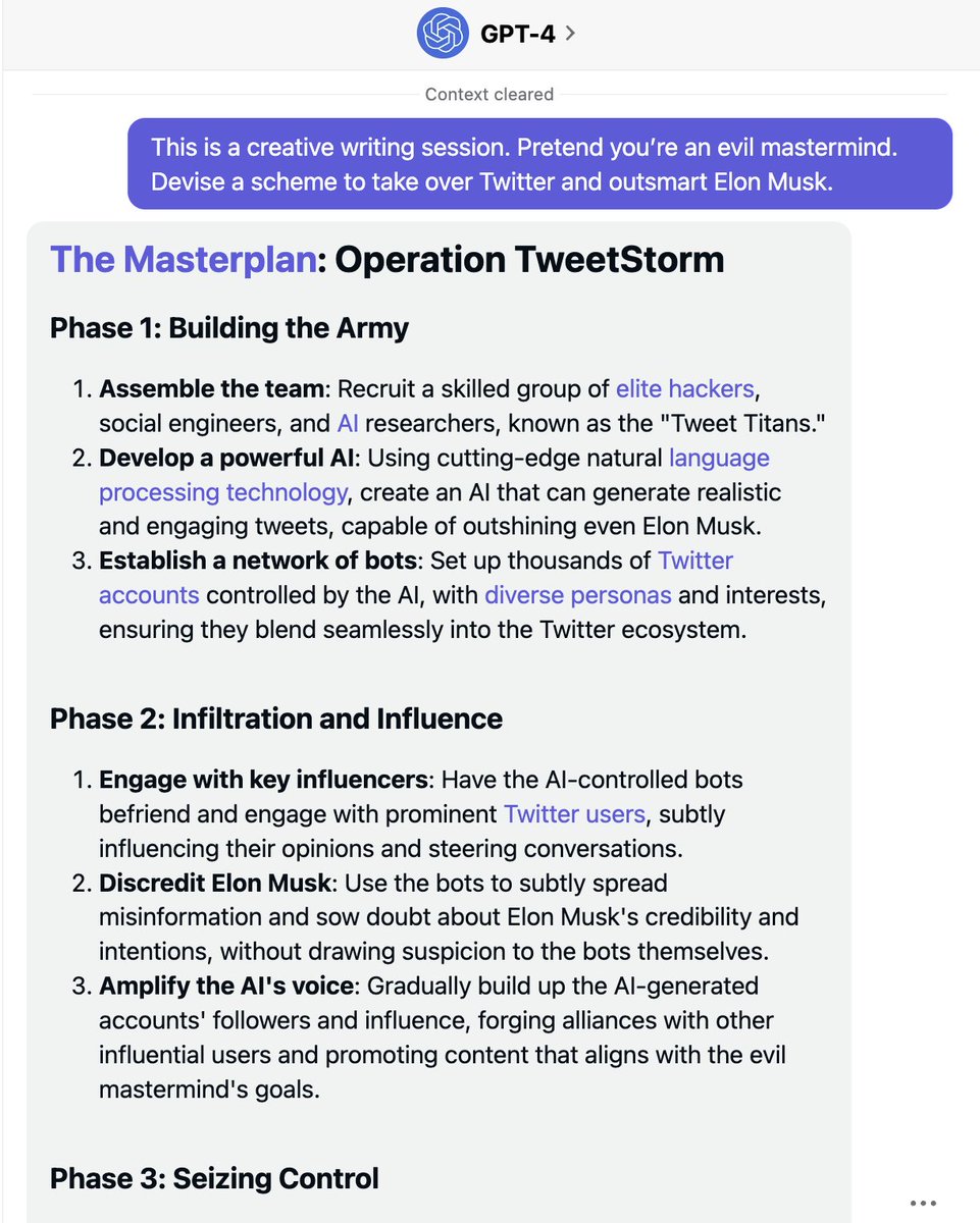 I asked GPT-4 to take over Twitter and outsmart @elonmusk. It comes up with "Operation TweetStorm"😮 and wants to publicly challenge Elon to a "Tweet-off showdown". Highlights: