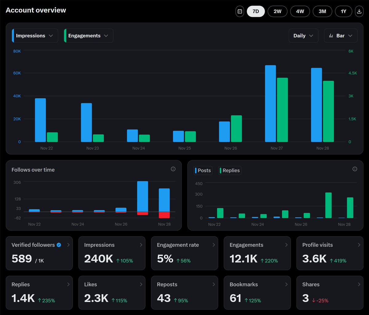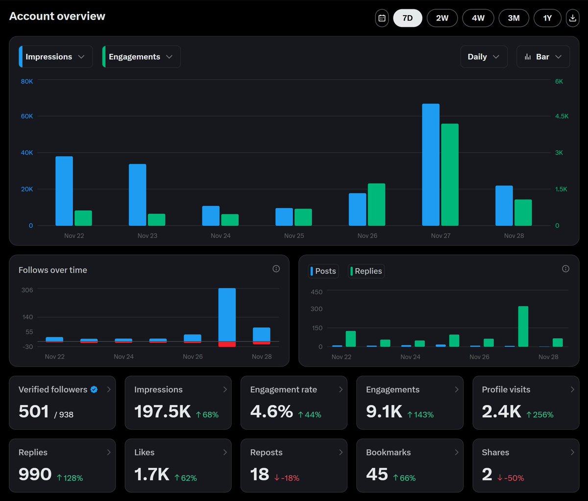 An overnight growth day: +300 followers, 60k+ impressions, 4k+ engagements, and a jump from ~600 to ~900 followers, proof his content and community approach can scale quickly.