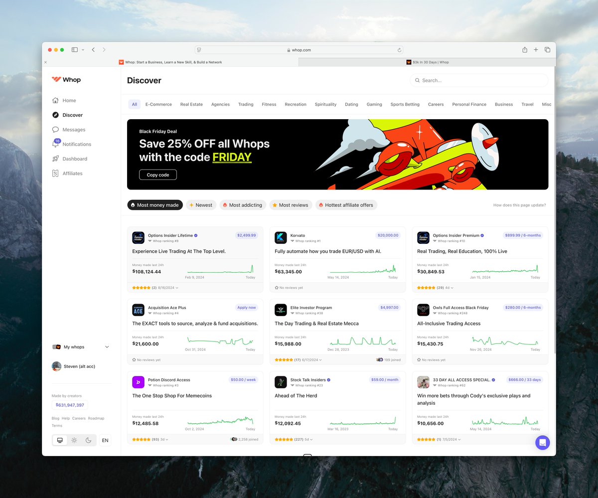 Secured a $200M strategic investment from Tether valuing Whop at $1.6B while scaling the platform to generate over $1B/year for creators and creating 100+ millionaire creators, a rare combo of product traction, money, and real creator impact.