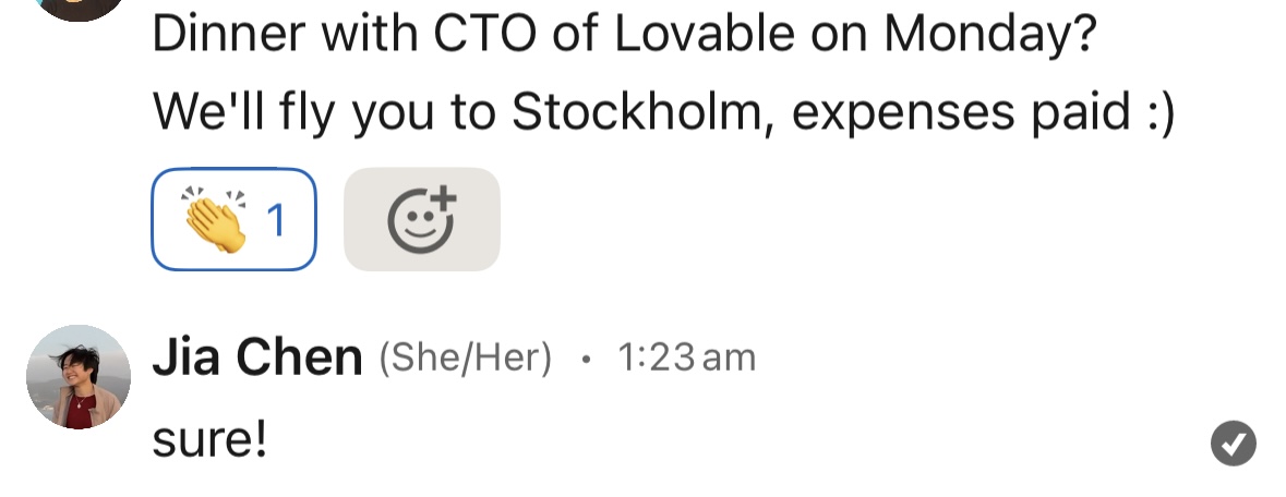 Fun fact: Jia has won hackathons at UPenn and Princeton, received a software engineering offer from Disney, grew from 0 to 10k followers in 8 months, and once publicly offered 70% equity to a non-technical cofounder, all while casually announcing a last-minute move to Stockholm.