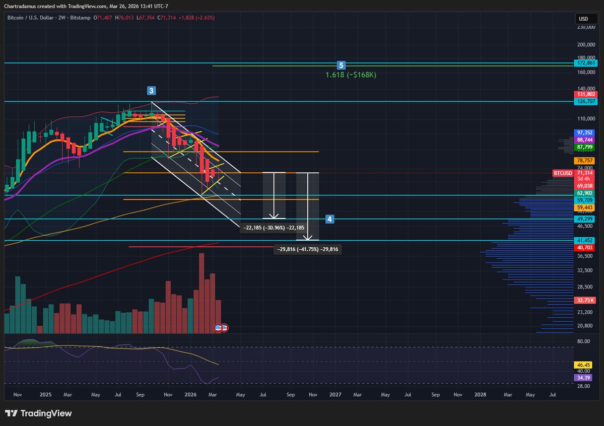 $BTC 🟡 Bottom ticked Bitcoin back in February as we navigated the low. I am now seeing signs of a Bearish Wedge forming, signifying that cryptocurrencies may have an additional leg lower in store. This outcome will be validated if $BTC loses $66K and rejects the support range of $66K-$71K to confirm the recent rally was simply a lower high. This price action is very reminiscent of the 2022 Bear Market. With a bearish move lower, keep your eyes on $59K to see if the Weekly 200MA and February Low act as a level to form a double bottom....