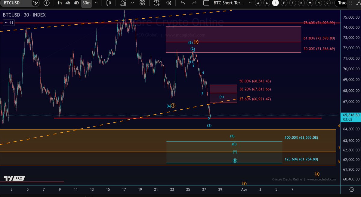 $BTC: Bitcoin has now reached a structural support line. We should see a wave (4) bounce over the weekend.