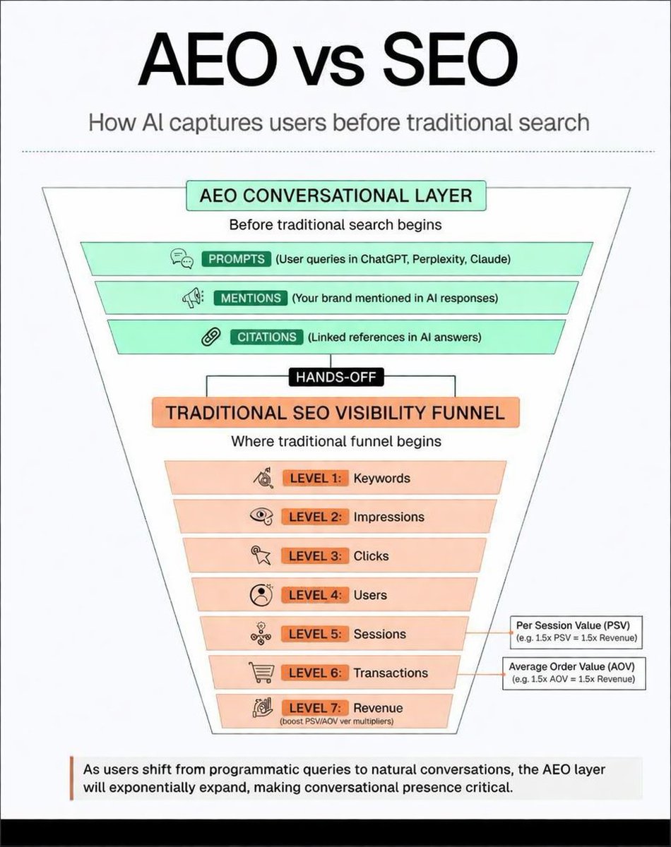 Your SEO funnel may be solid but users might never enter it. AI tools now answer questions before search begins. If your brand isn’t mentioned or cited, you’re invisible. Discovery now has two layers: AEO for AI answers, SEO for search. Winning brands build both.